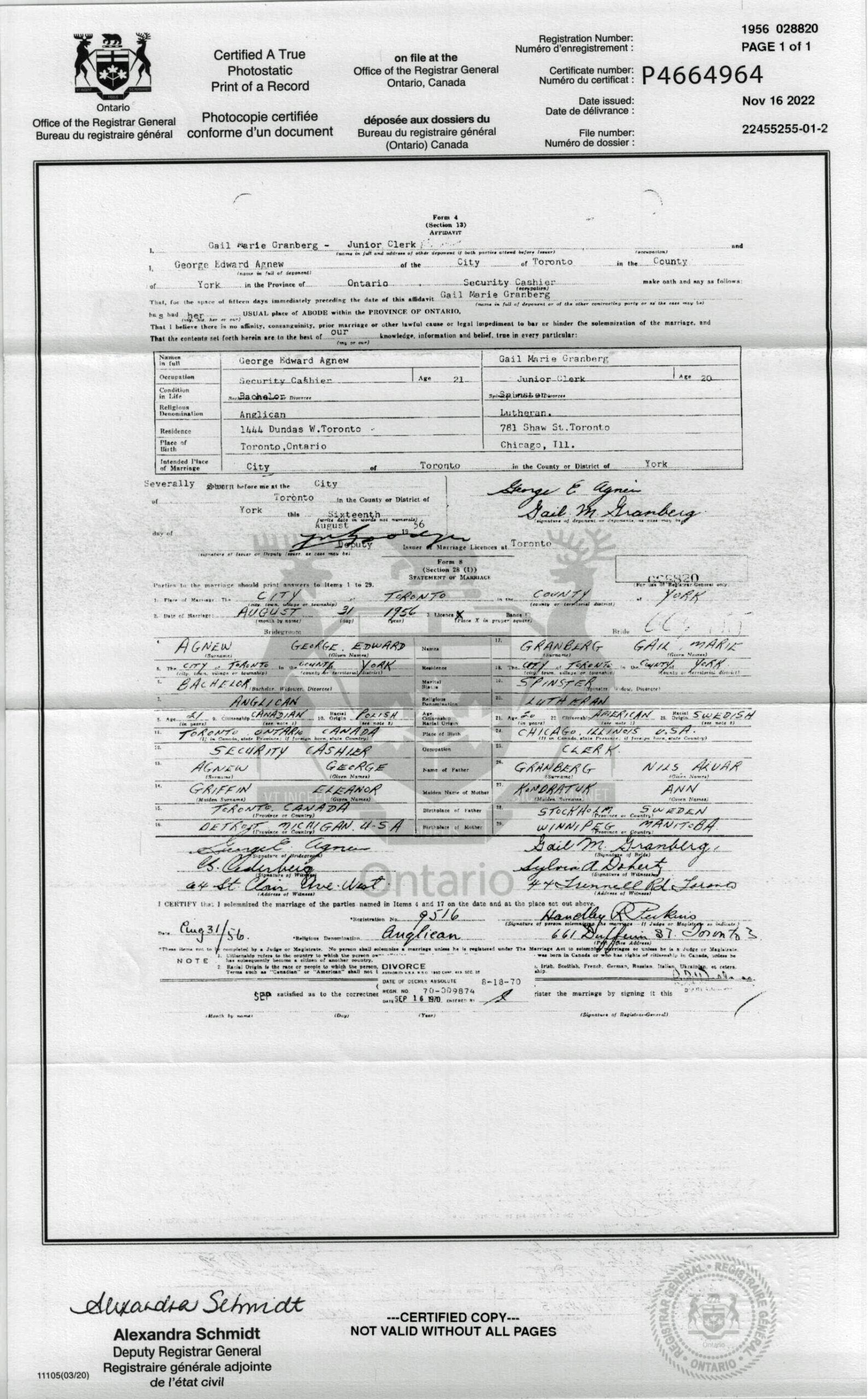 Marriage Certificate of George Agnew and Gail Marie Granberg (1936 - 2001)